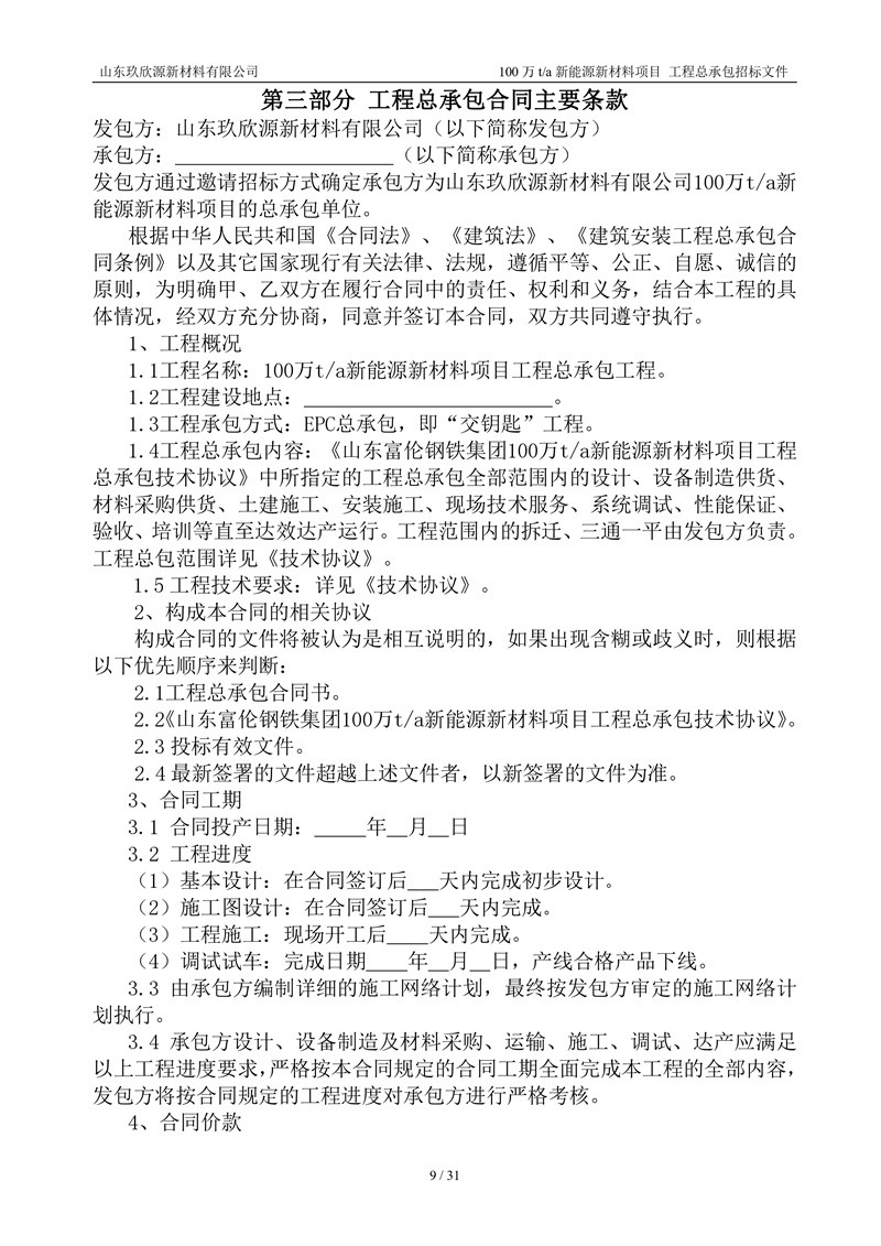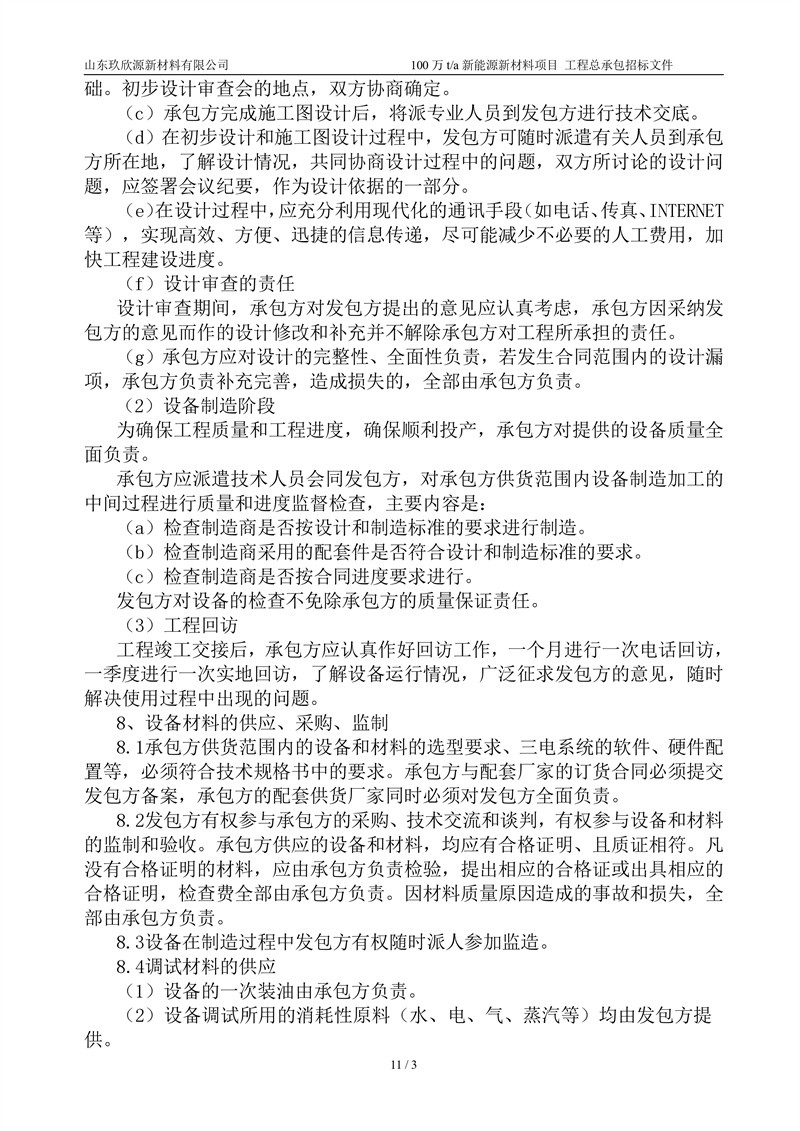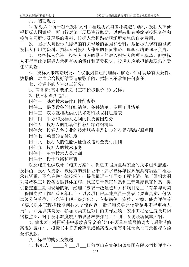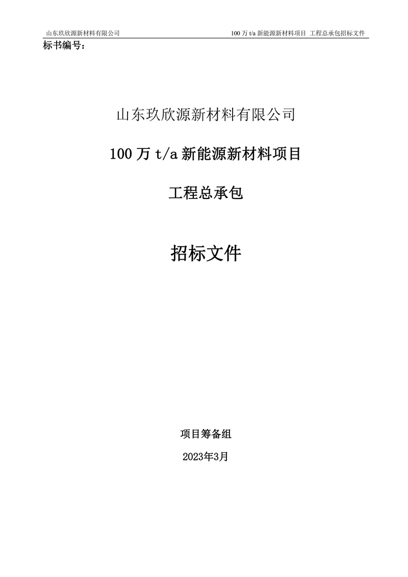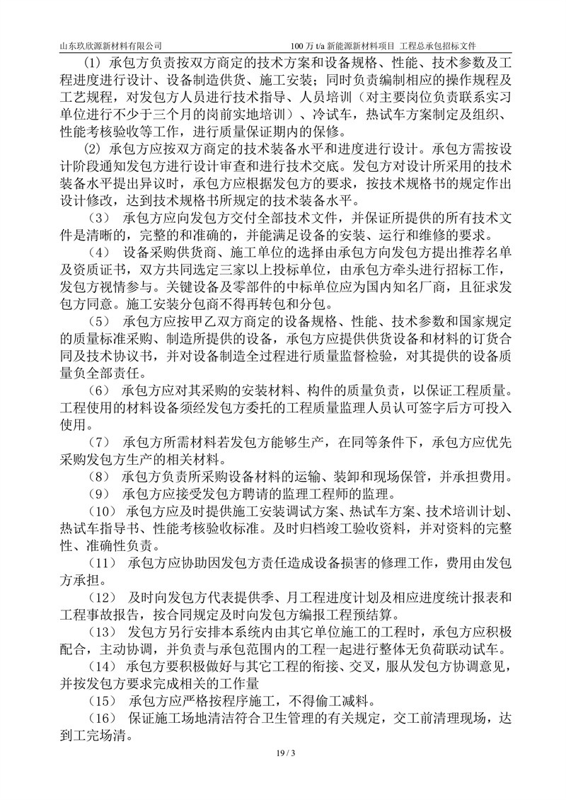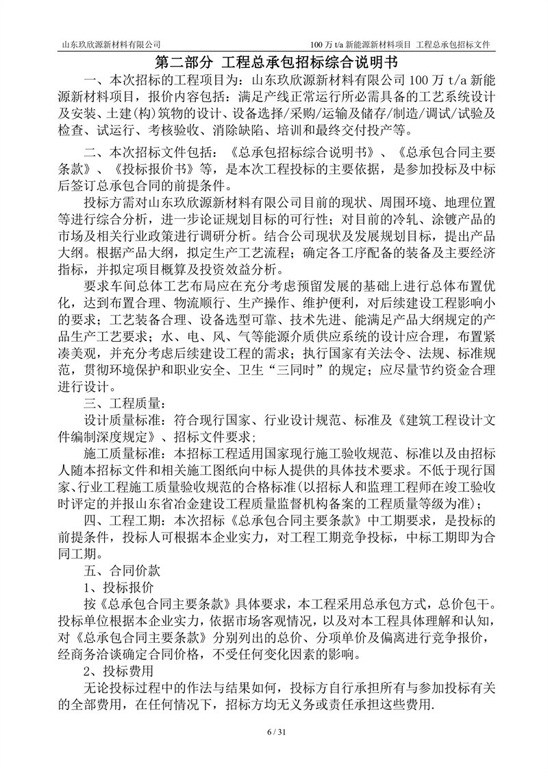 山东玖欣源新质料有限公司100万t/a新能源新质料项目工程总承包招标文件