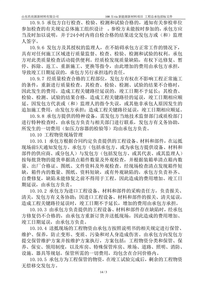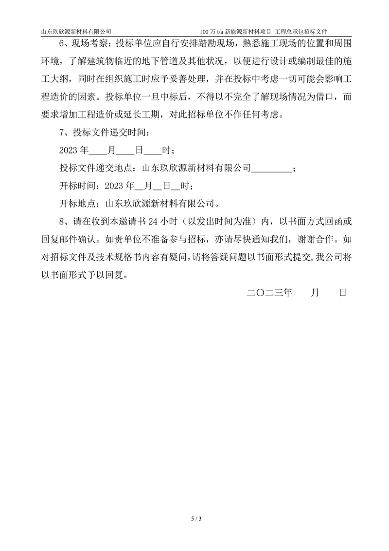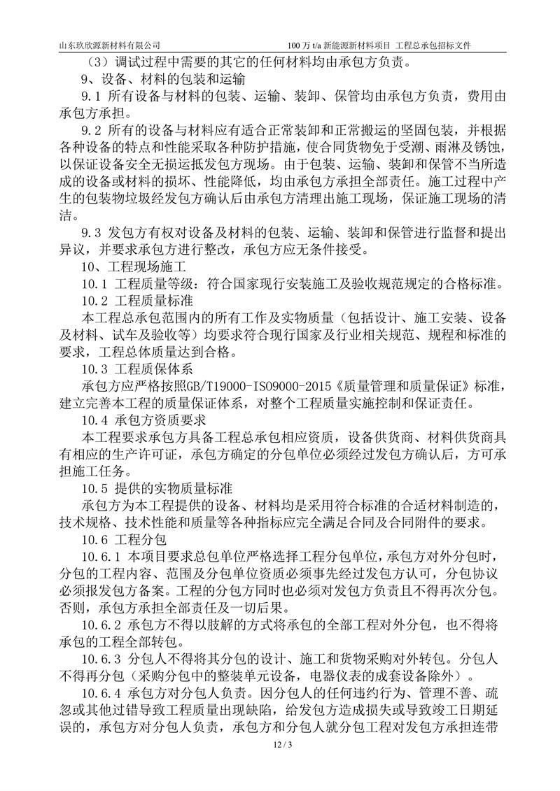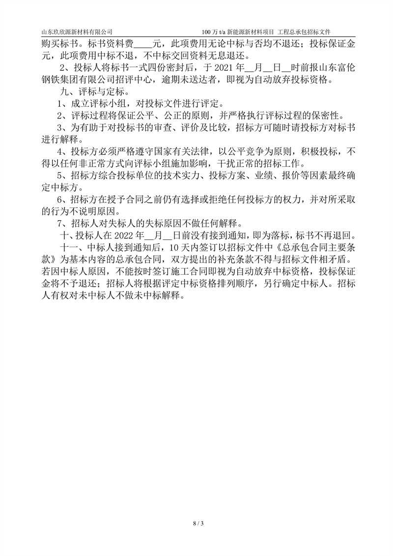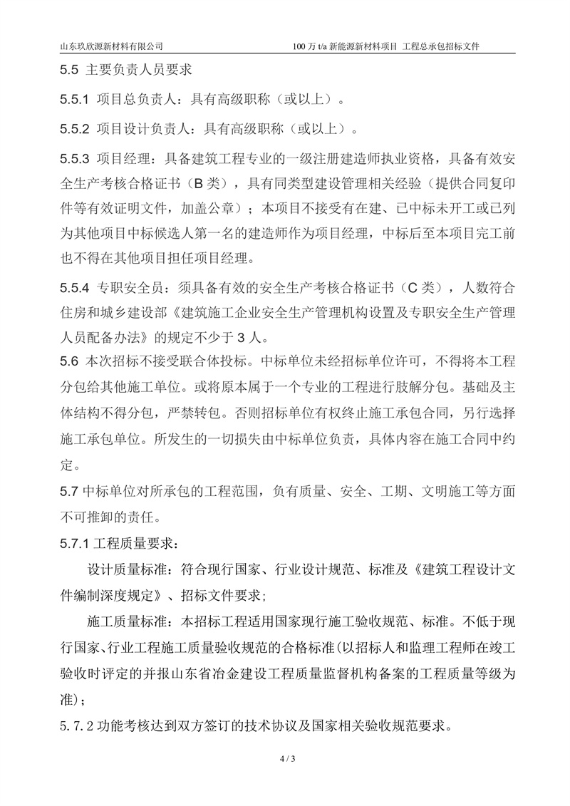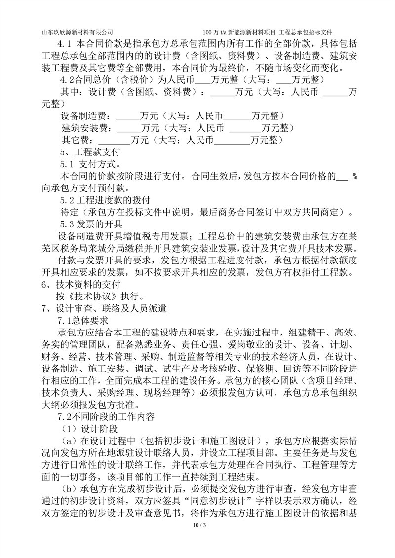 山东玖欣源新质料有限公司100万t/a新能源新质料项目工程总承包招标文件